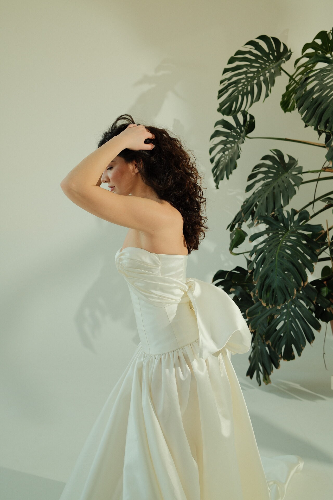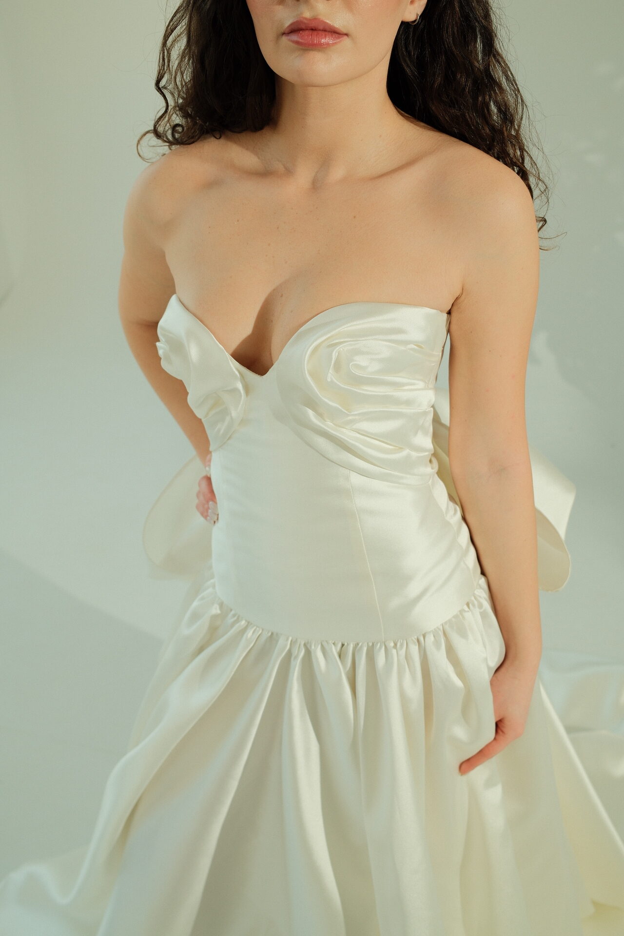 A-სილუეტის ატლასის საქორწილო კაბა გულის ფორმის კორსეტით: Aera