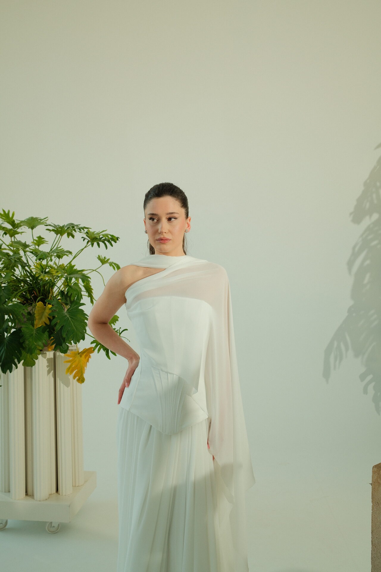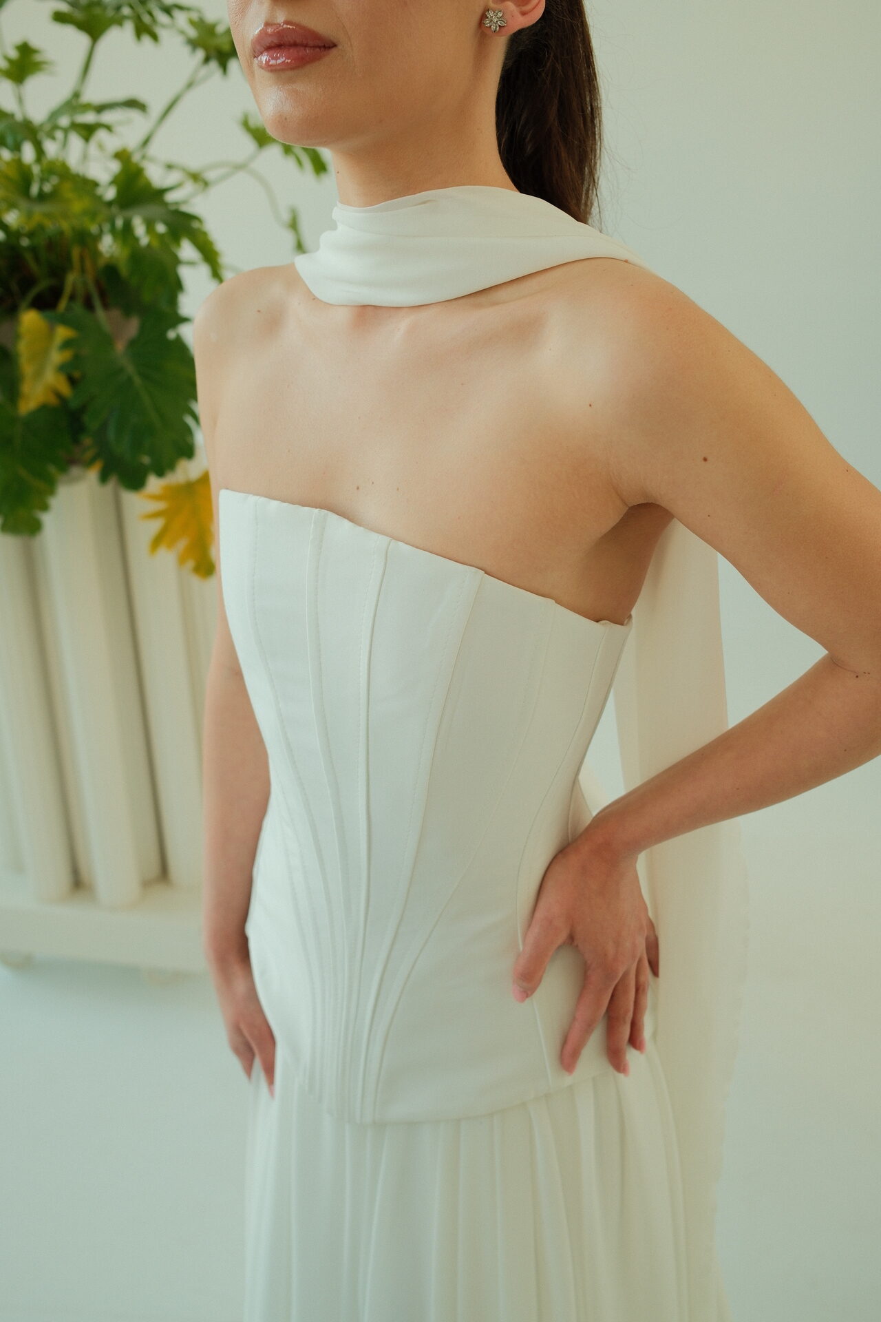 საქორწილო კაბა Eva დახვეწილი არჩევანია პატარძლებისთვის, რომლებსაც სურთ სადა სტრუქტურა ერთი მკვეთრად გამორჩეული დეტალით. ბრეტელების გარეშე შექმნილი კორსეტი უზრუნველყოფს სხეულზე იდეალურად მორგებულ ფორმას, ხოლო ყელზე შესაკრავი შარფი მატებს თანამედროვე, მოდურ (editorial) შტრიხს, რომელიც ძალიან ბუნებრივად და მსუბუქად გამოიყურება.
