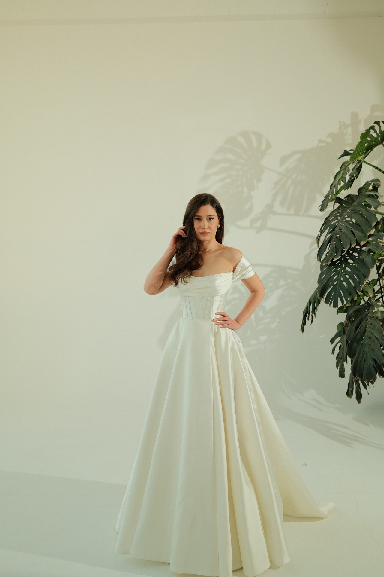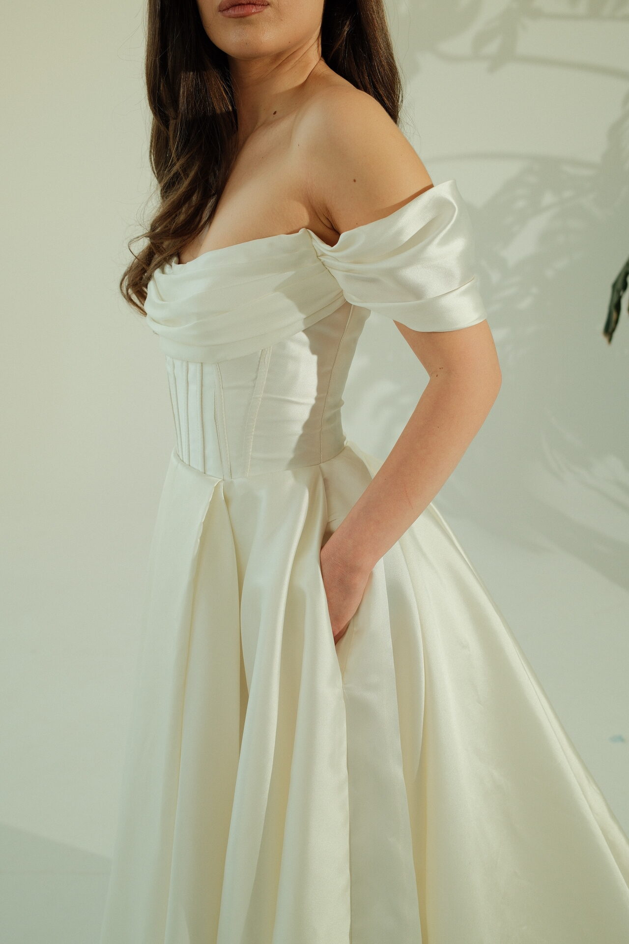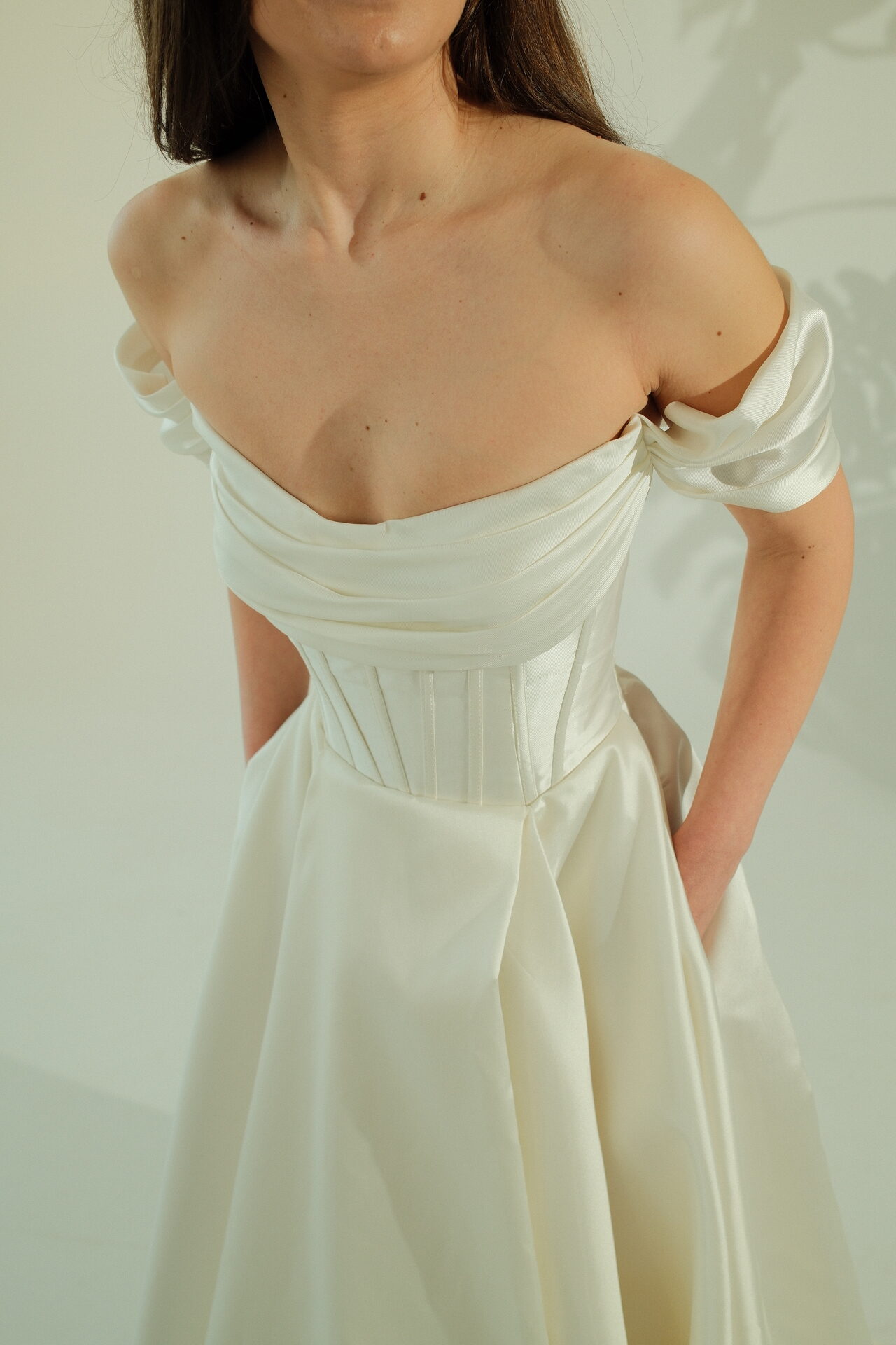 A-სილუეტის საქორწილო კაბა ატლასის კორსეტითა და მოშიშვლებული მხრებით: Rue