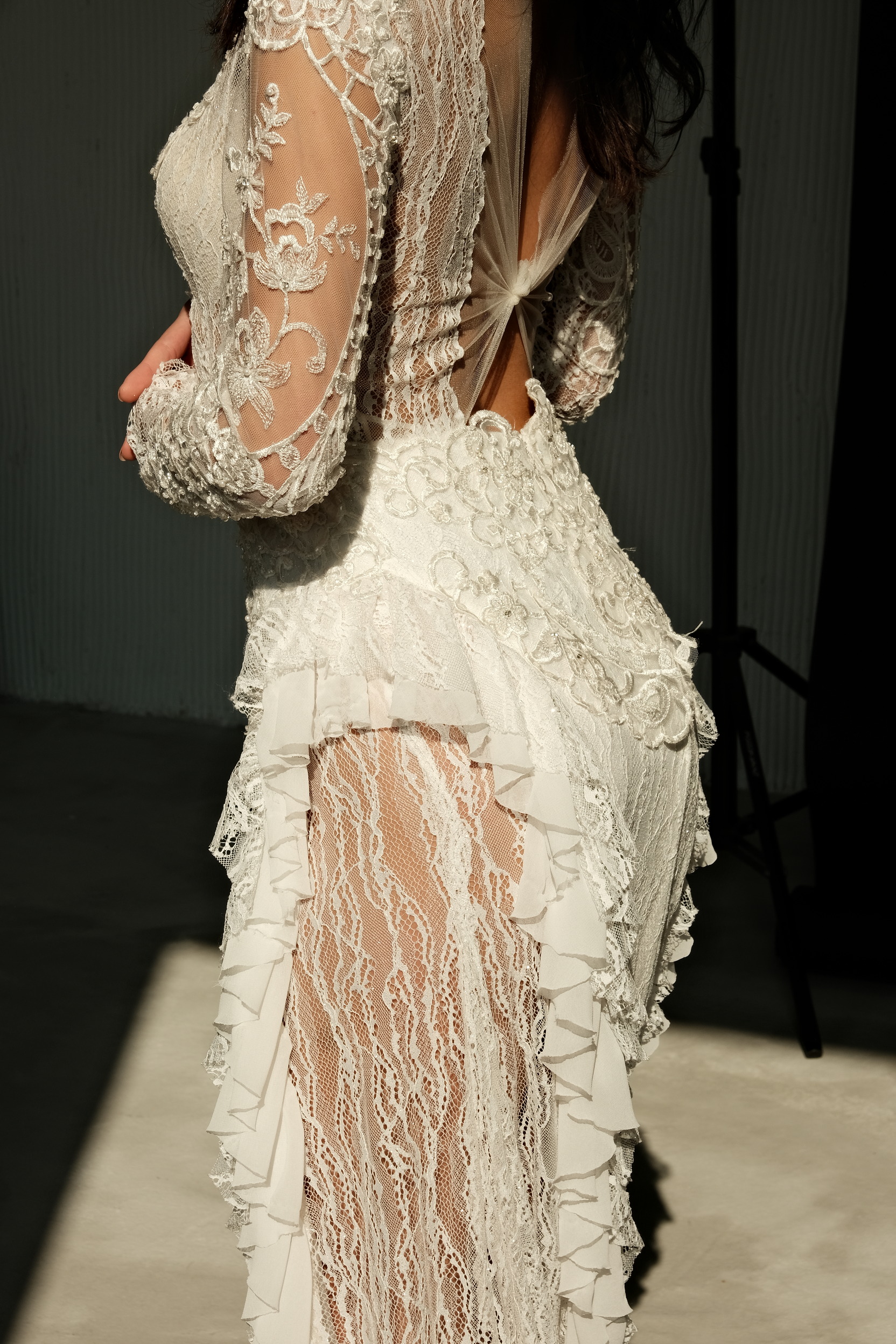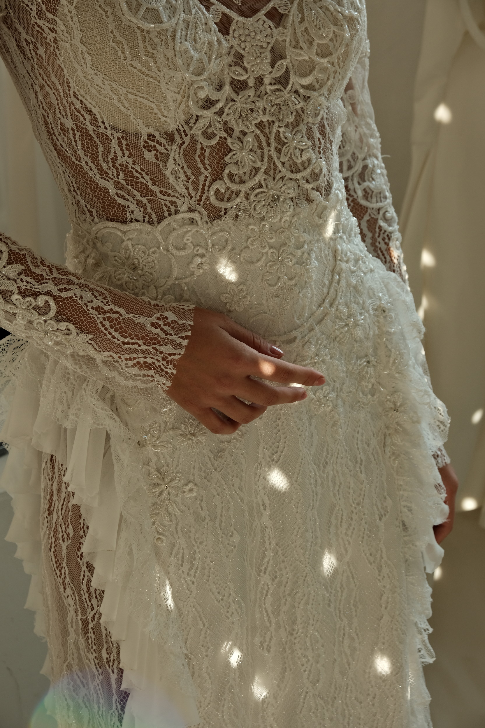 მაქმანებიანი დეტალებითა და კლასიკური A-სილუეტით, ეს გრძელმკლავიანი ვინტაჟური საქორწილო კაბა მარადიულ შარმს ასხივებს. გამჭვირვალე მაქმანის აქცენტები კაბას ანიჭებს ნაზ და ჰაეროვან იერს, ხოლო გრძელი მკლავები – დახვეწილობასა და ტრადიციულობას. ყველა დეტალი, მაქმანებიანი მკლავებიდან დაწყებული, იატაკამდე ჩამოშვებული ქვედაბოლოთი დამთავრებული, ზედმიწევნით არის დამუშავებული, რათა თქვენ თავს თავდაჯერებულად და ლამაზად გრძნობდეთ.