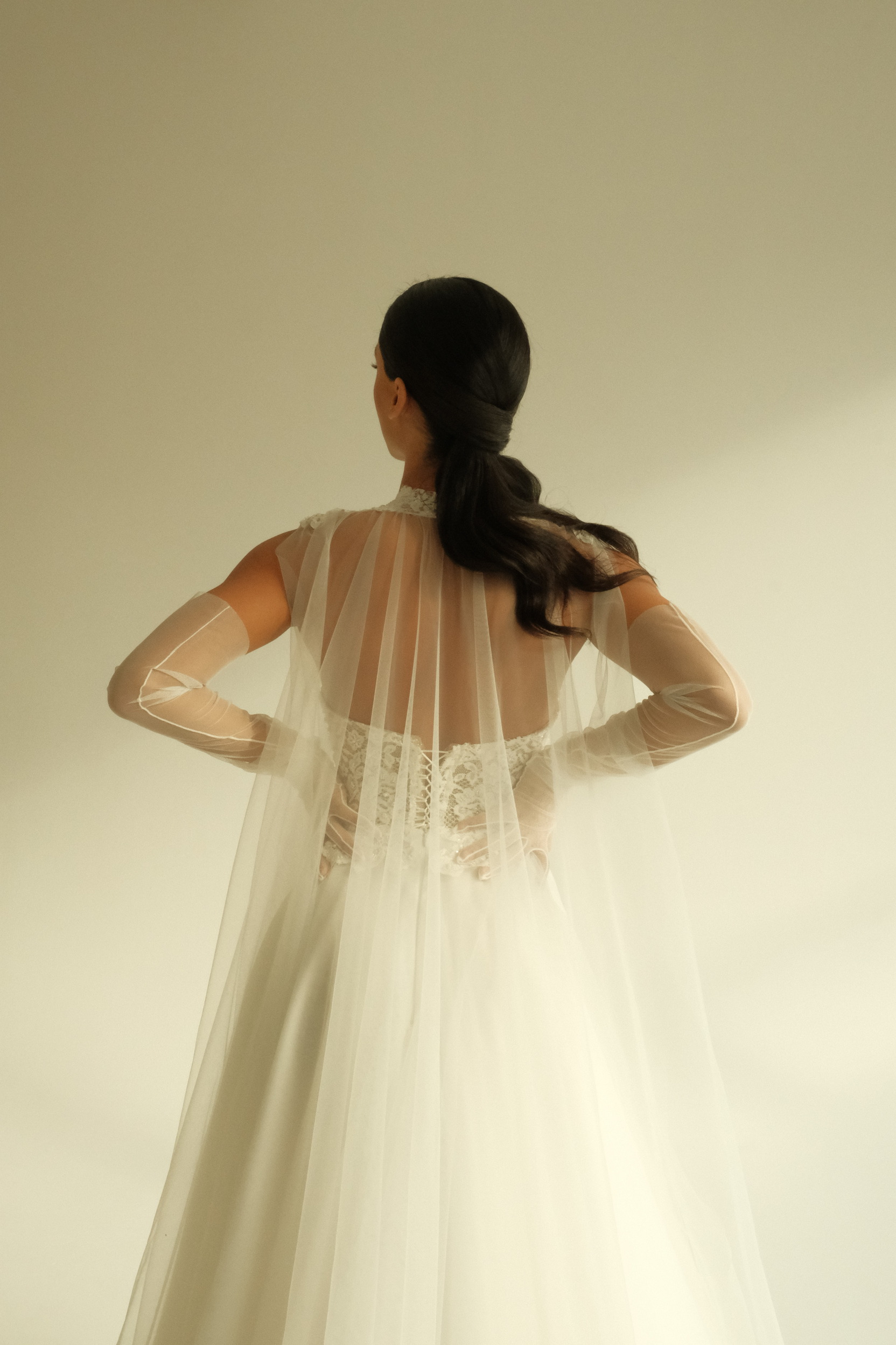 გამჭვირვალე ზურგი მაქმანებიანი აქცენტებით ქმნის მოულოდნელ და ელეგანტურ ეფექტს. მოცურავე ფატინის ქვედაბოლო მატებს კაბას სიმსუბუქეს და ჰაეროვნებას.