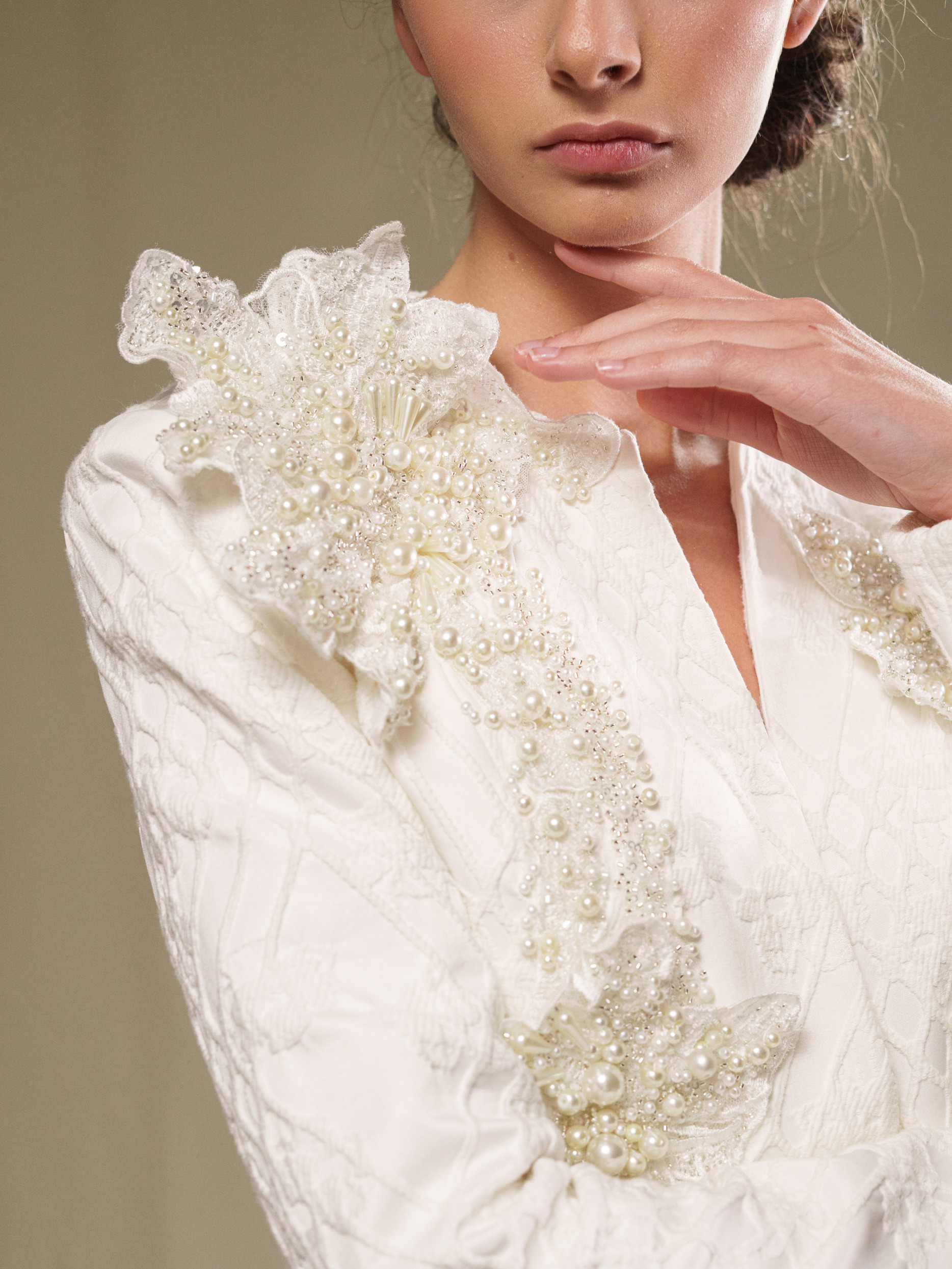 Royal Disruption: ორეული ქსოვილის ტიპი ჟაკარდით, 3D ყვავილებით და მარგალიტებით