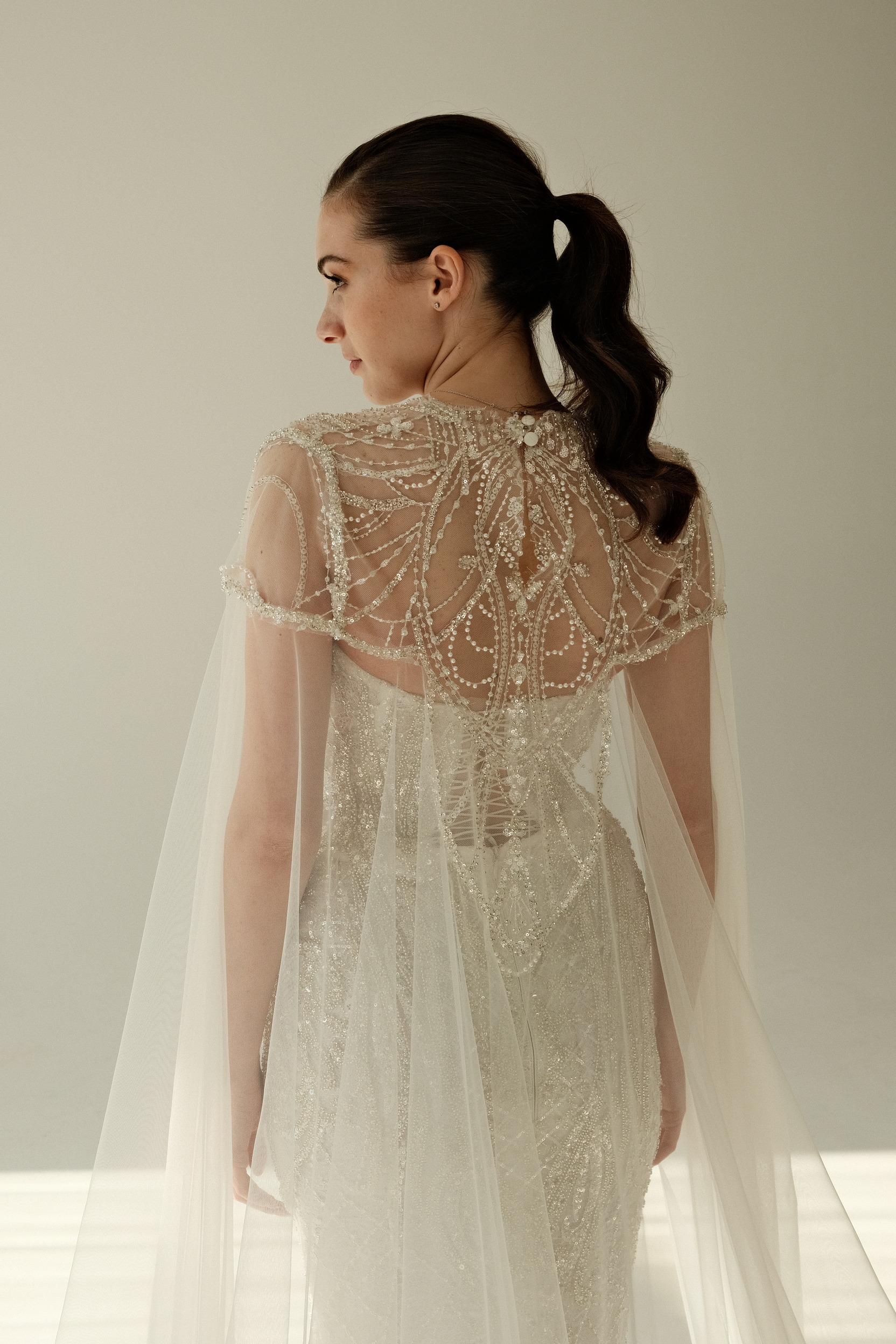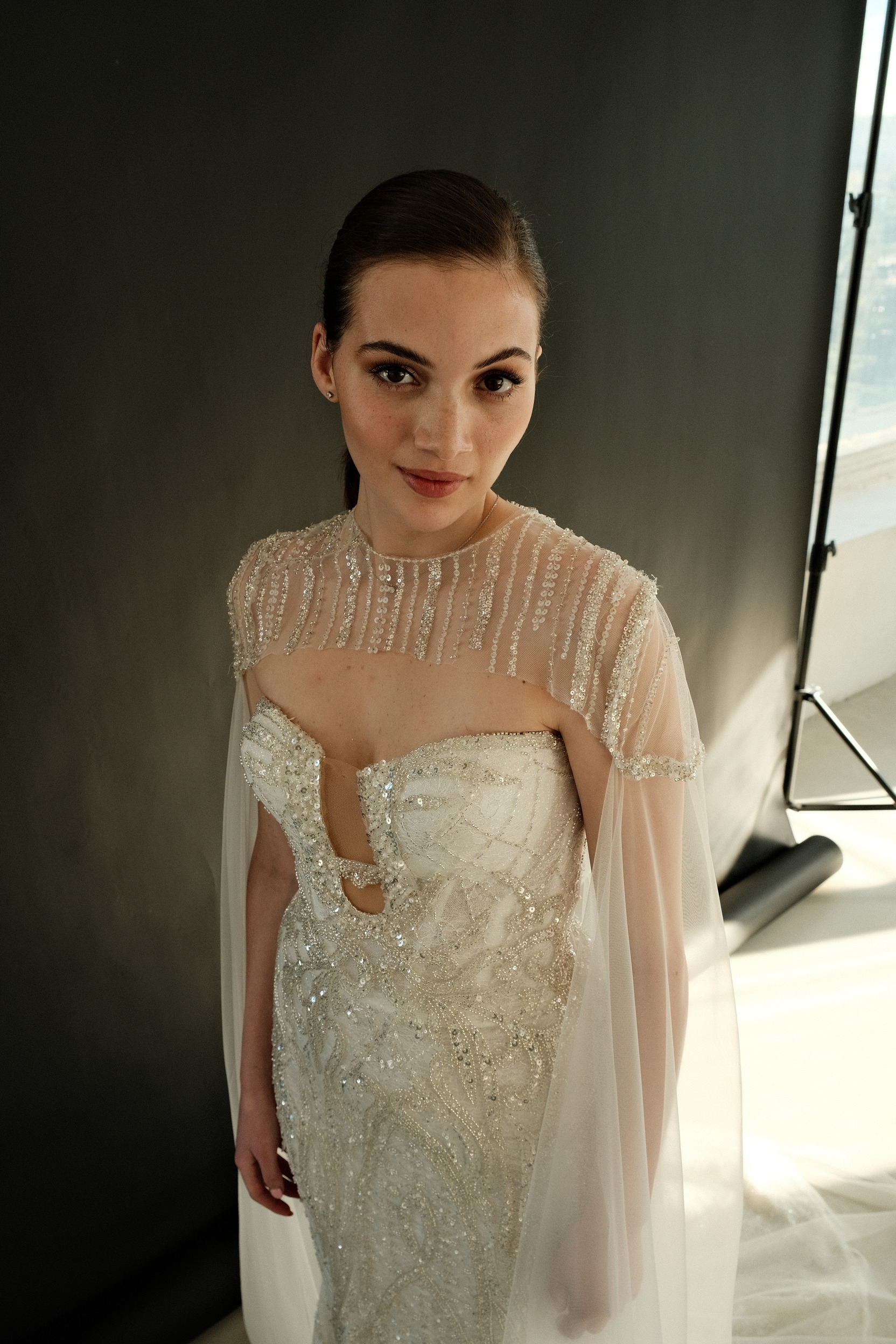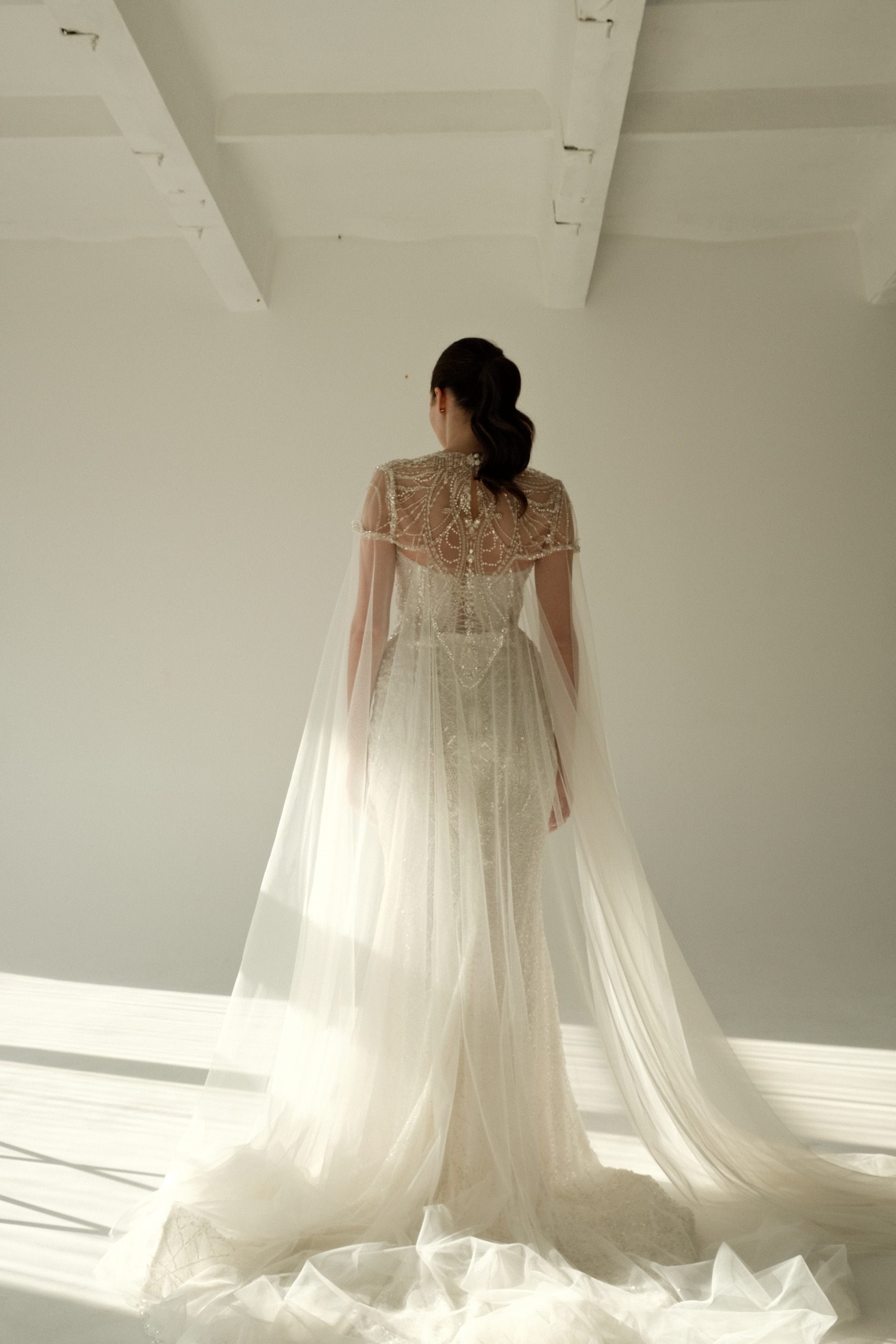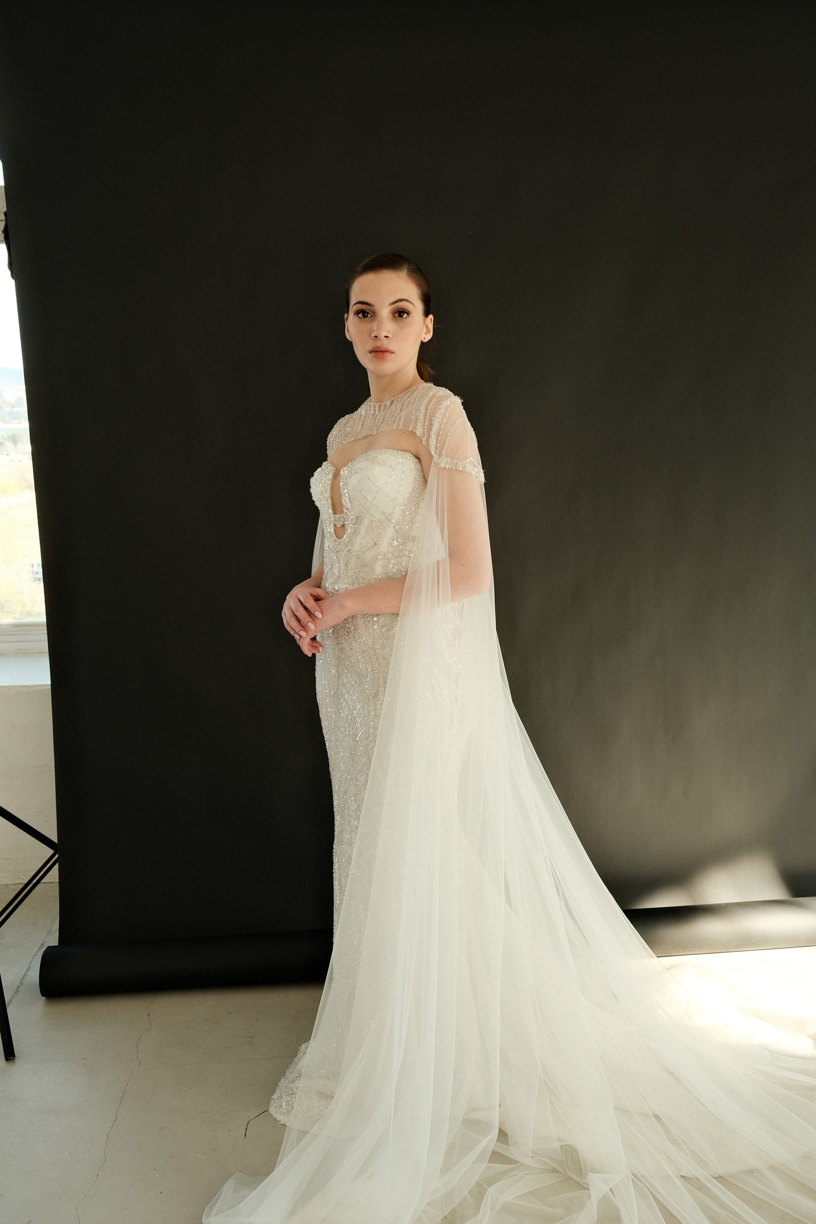 კაბის მთავარი აქცენტი არის მოსასხამი, რომელიც მხრებზე ეშვება და ქვედაბოლოსთან ერთად ქმნის შლეიფს. მოსასხამი მორთულია იმავე კრისტალებით, რაც კაბაზეა, რაც მას განსაკუთრებულ იერს ანიჭებს და იდეალურია პატარძლებისთვის, რომლებიც აფასებენ როგორც ტრადიციულ ხიბლს, ასევე თანამედროვე სტილს.