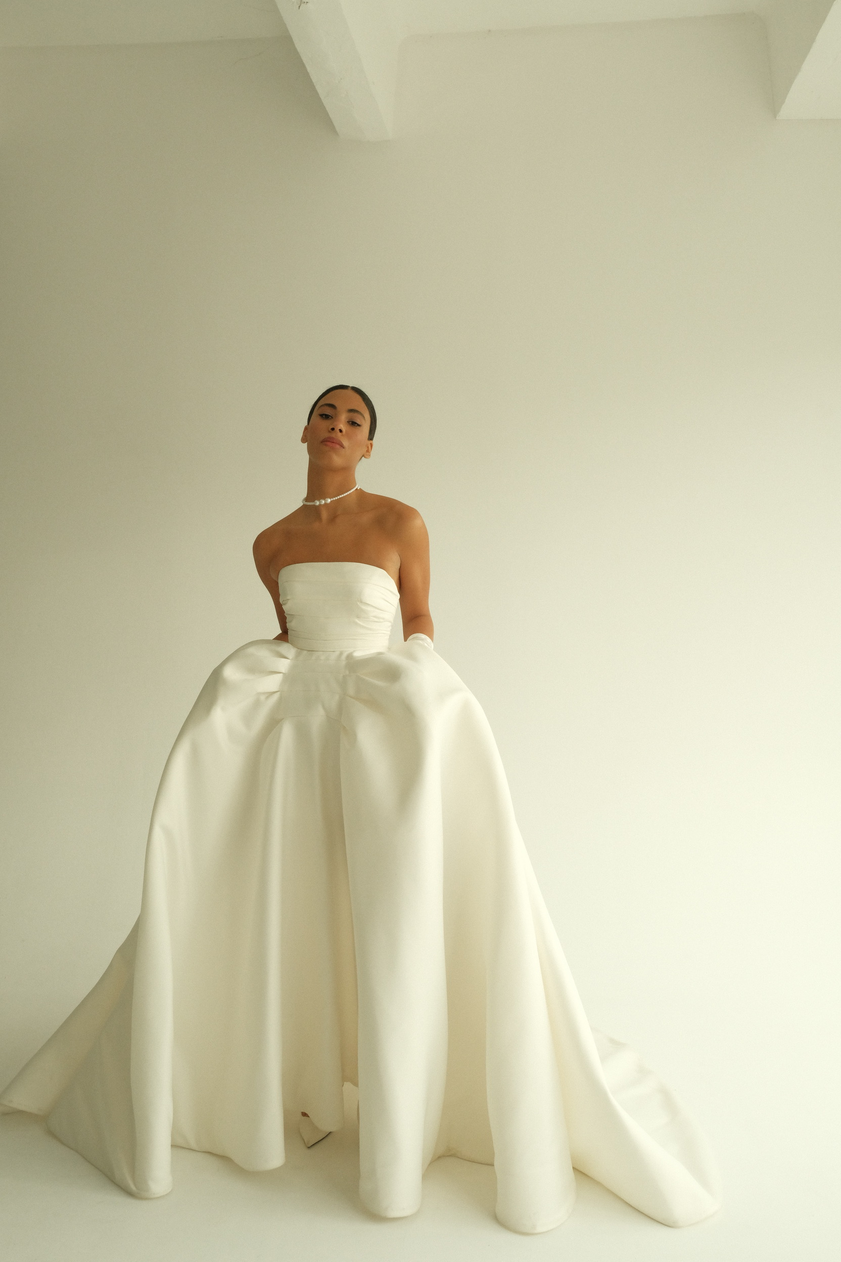 ტაფტასა და ატლასის ტრადიციული საქორწილო კაბა “Luminous Grace” არის მინიმალისტური ელეგანტურობის ულამაზესი მაგალითი. ეს კაბა იდეალურია პატარძლებისთვის, რომლებიც ამჯობინებენ უფრო მარტივ, მაგრამ დახვეწილ იერს. კაბის გლუვი და მარტივი დიზაინი საშუალებას აძლევს მაღალი ხარისხის ტაფტასა და ატლასის ქსოვილებს გამოავლინონ თავიანთი მდიდრული ხასიათი.